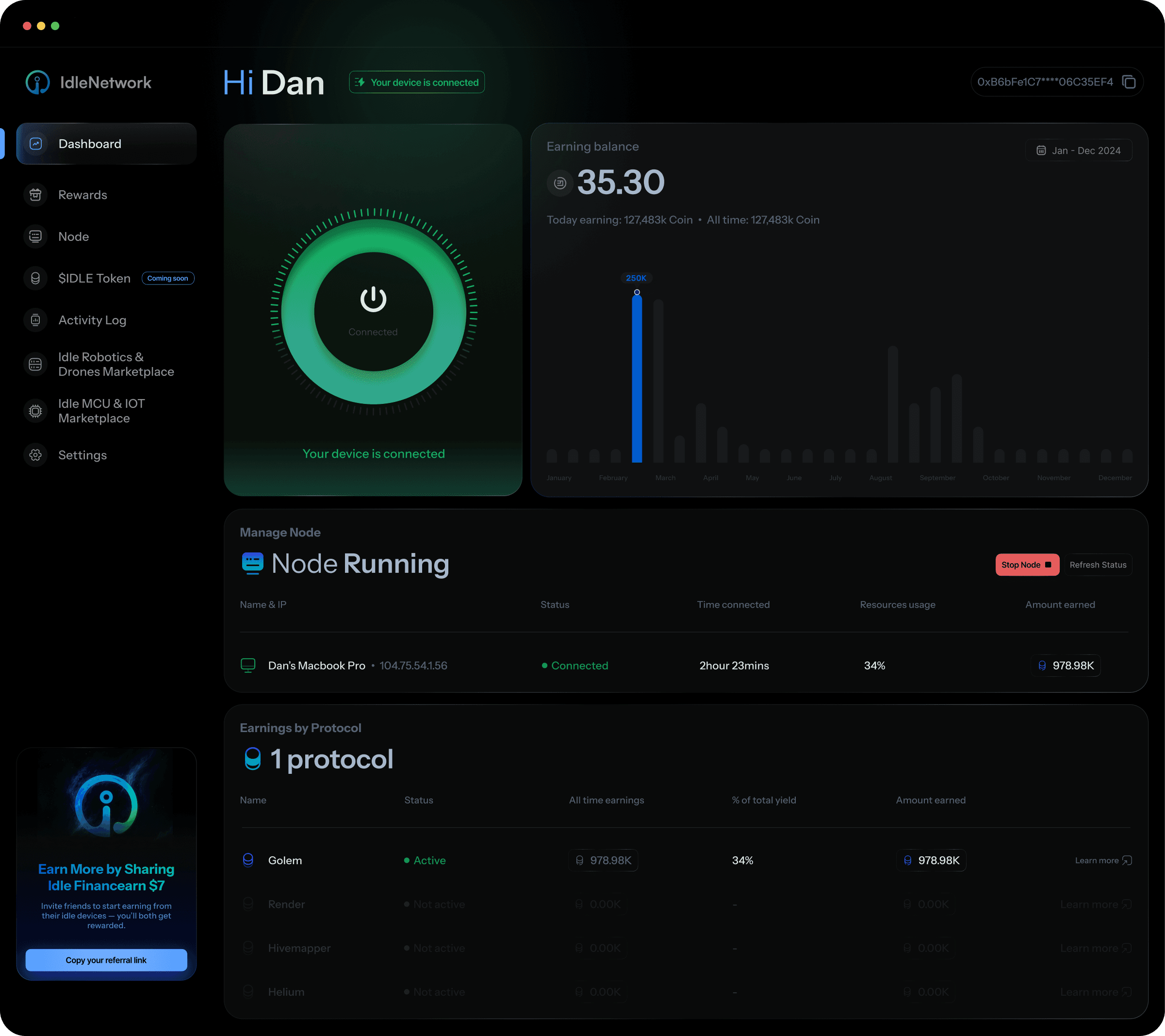 Connect underutilized enterprise hardware—such as warehouse drones, factory robots, and surplus compute, storage, or bandwidth—to the IdleNetwork network. Enable businesses and individuals to monetize idle assets by leasing their capacity, generating seamless on-chain revenue.